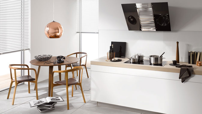 Bij de nieuwe Miele-afzuigkap DA 6096 Black Wing met vrije hoofdruimte biedt het schuin aangebrachte wasemscherm vooral voor lange mensen meer bewegingsvrijheid boven de kookplaat. Het wasemscherm is gemaakt van speciaal veiligheidsglas en verkrijgbaar in de kleur obsidiaanzwart. En wat zo bijzonder is: door de compacte ventilatie-unit is de anders altijd gebruikelijke schouw voor dit apparaat in de meeste gevallen overbodig.