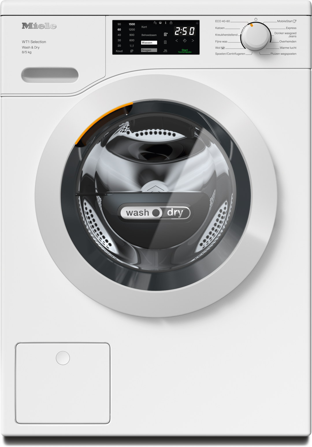 - 4.Tijdens de ontwikkelfase van de serie was-droogcombinaties WT1 heeft Miele de modellen en kerncomponenten met 5.000 was- en 4.000 droogcycli (= 5 was- en 4 droogcycli per week gedurende 50 weken per jaar) in diverse programma's getest. Meer: miele.com/20years
