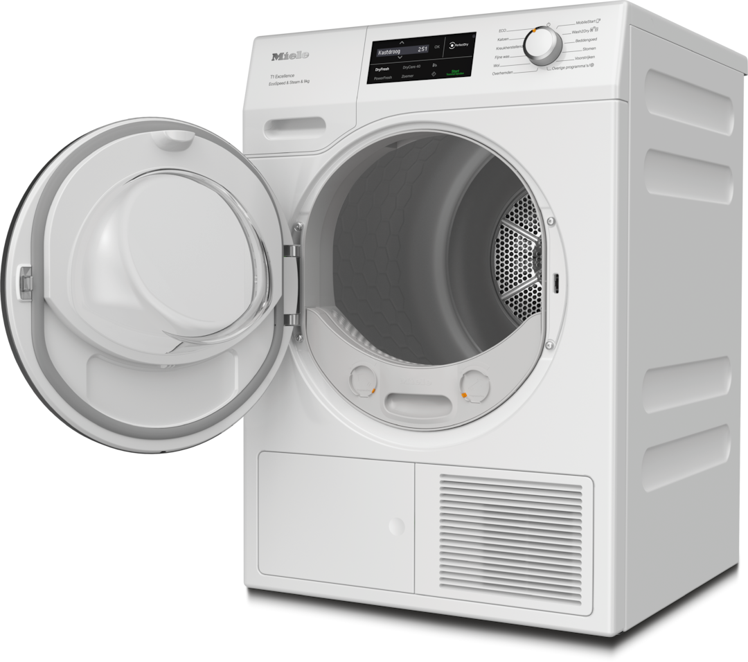 - 6.Tijdbesparing berekend in vergelijking met Miele drogers zonder EcoSpeed met dezelfde belading en een vergelijkbare energie-efficiëntie. Getest in het programma “Katoen” met volledige belading.
