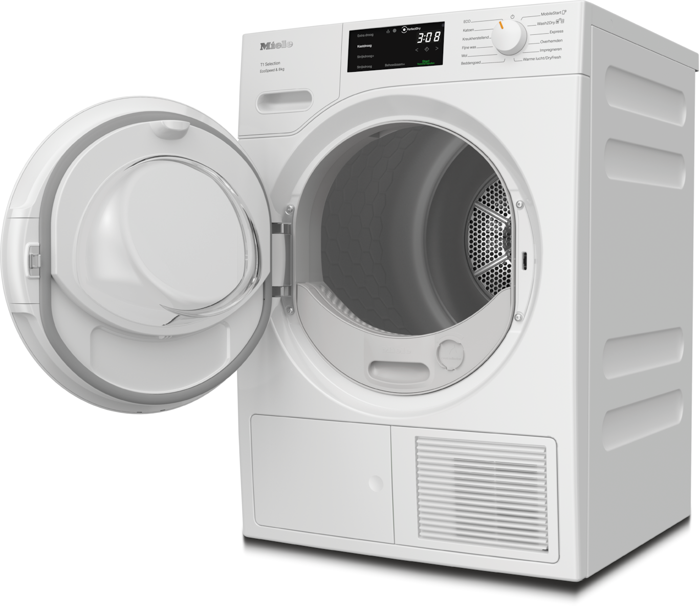 - 5.Tijdbesparing berekend in vergelijking met Miele drogers zonder EcoSpeed met dezelfde belading en een vergelijkbare energie-efficiëntie. Getest in het programma “Katoen” met volledige belading.