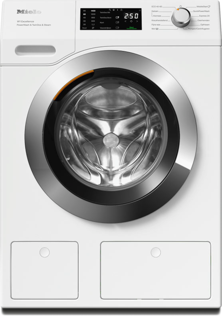 - 12.Tijdens de ontwikkelingsfase van de wasmachineseries W1 / W2 heeft Miele de modellen en kernonderdelen getest in 5000 wascycli (= 5 wascycli per week gedurende 50 weken per jaar) in verschillende programma's. Meer: miele.com/20years