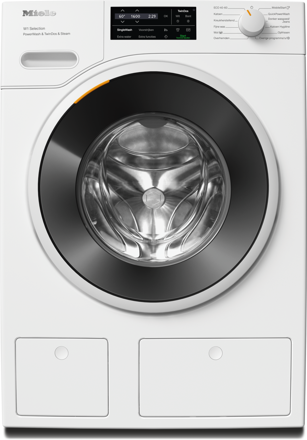- 14.Tijdens de ontwikkelingsfase van de wasmachineseries W1 / W2 heeft Miele de modellen en kernonderdelen getest in 5000 wascycli (= 5 wascycli per week gedurende 50 weken per jaar) in verschillende programma's. Meer: miele.com/20years