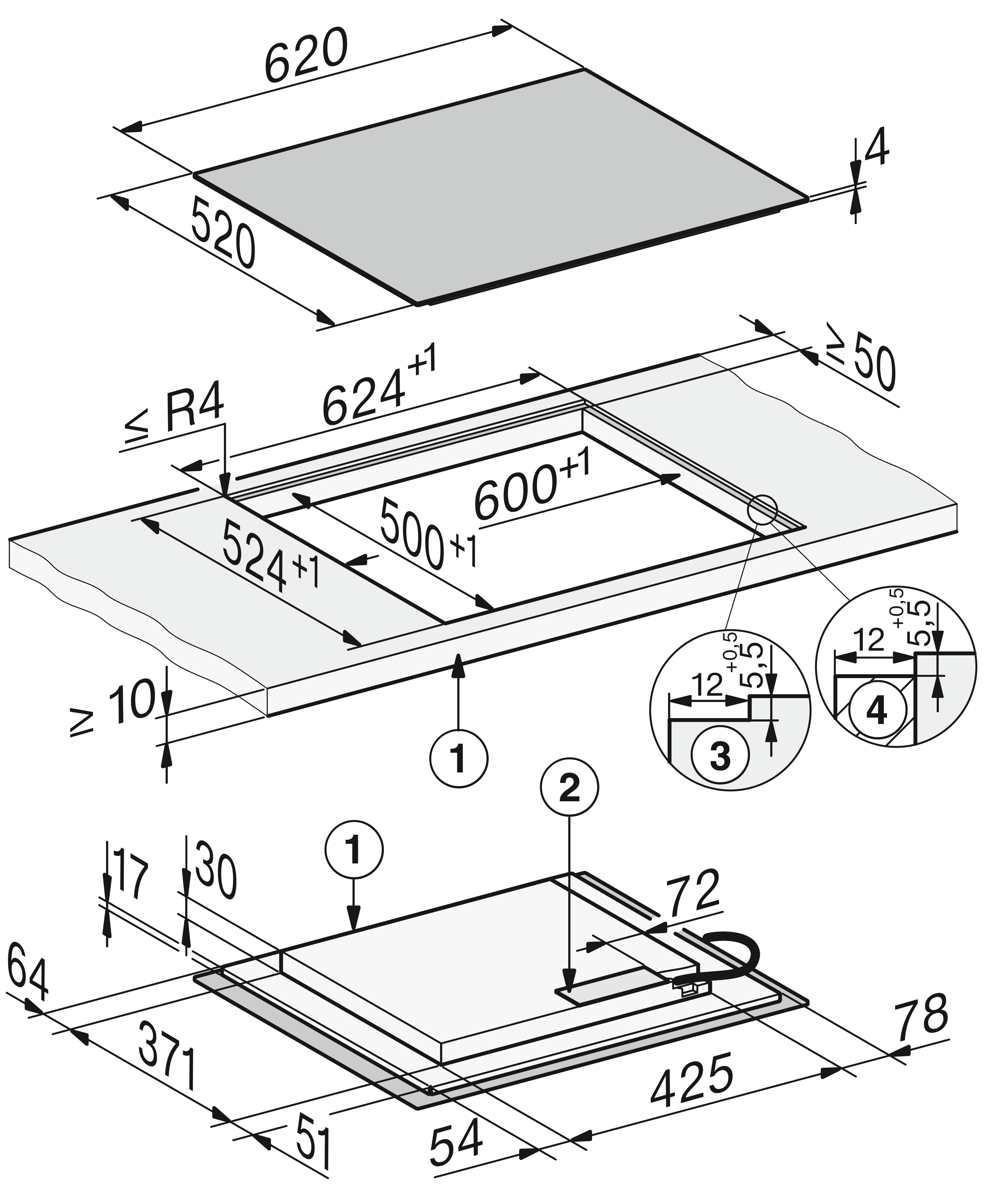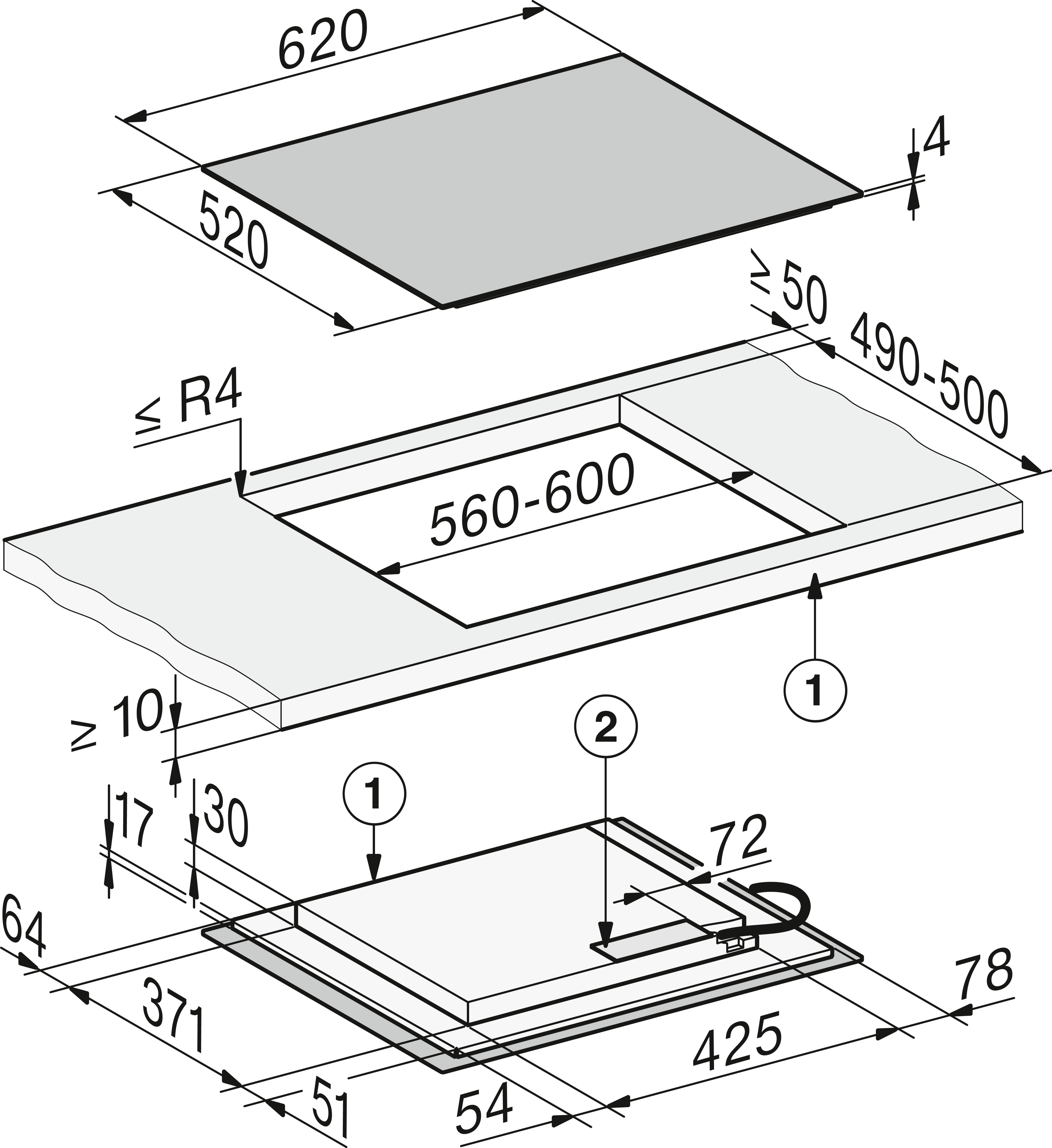 - In 620 mm breed voor integratie in of plaatsing op het werkblad