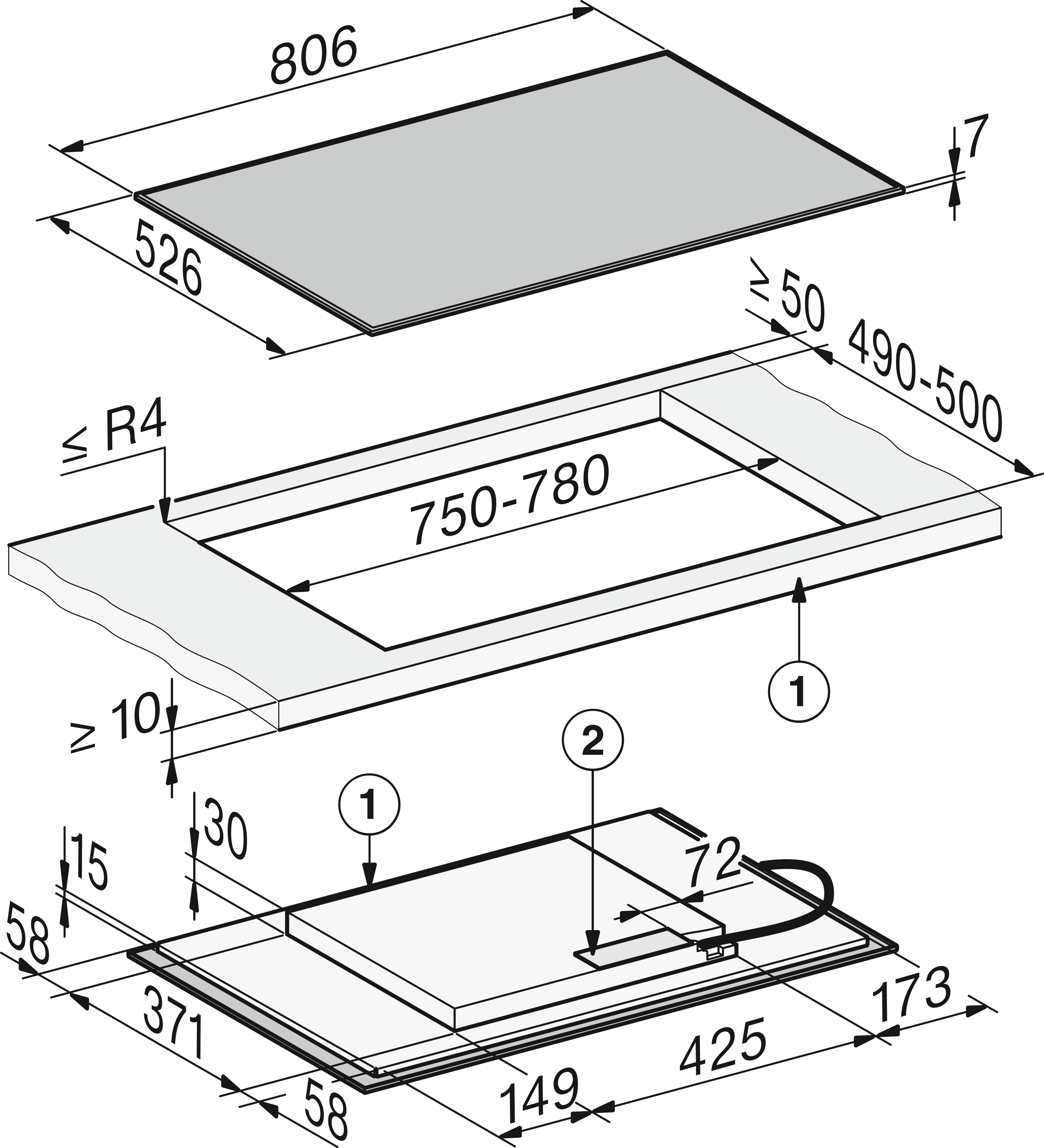 - In 806 mm breed met rvsframe voor plaatsing op het werkblad