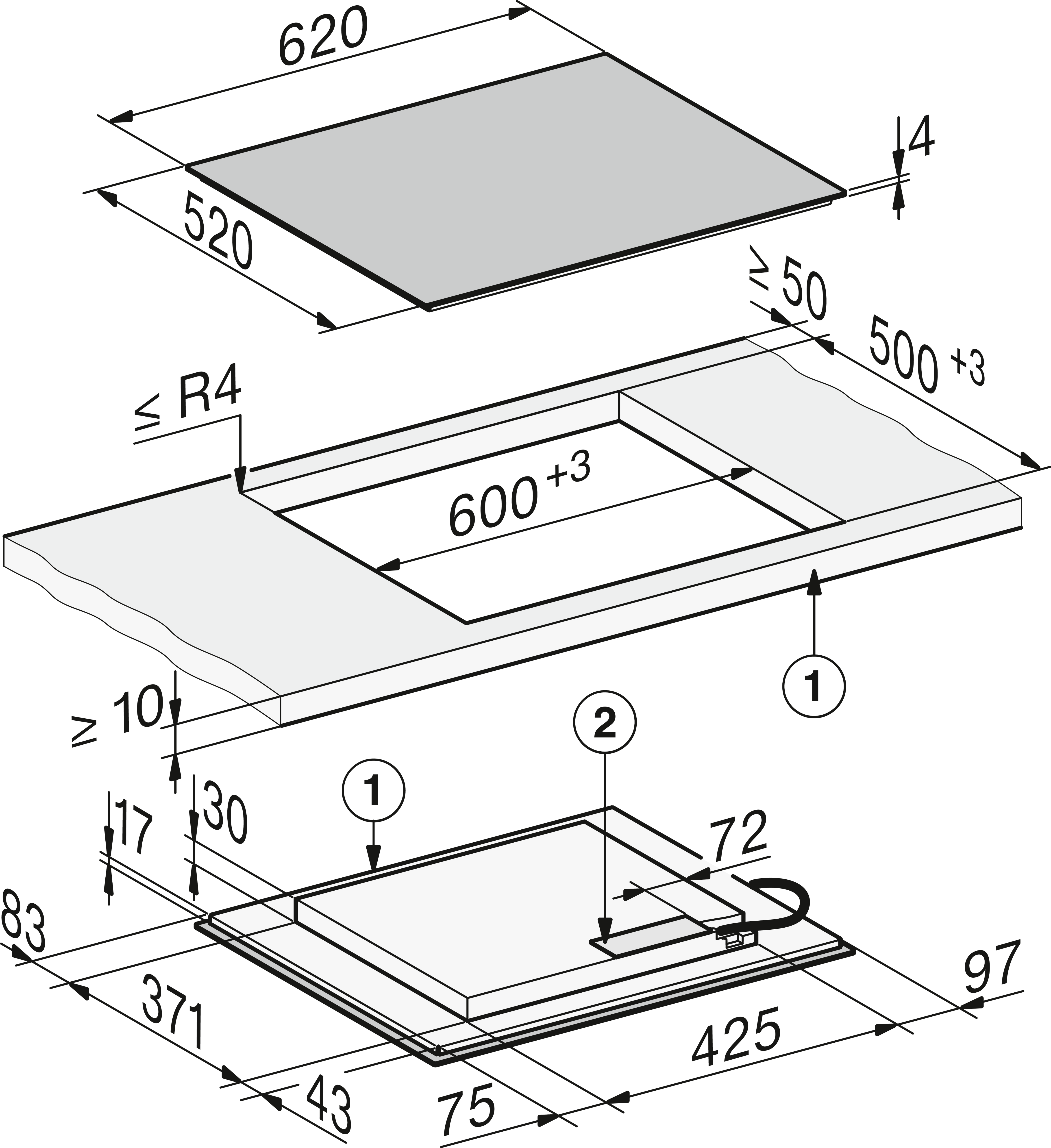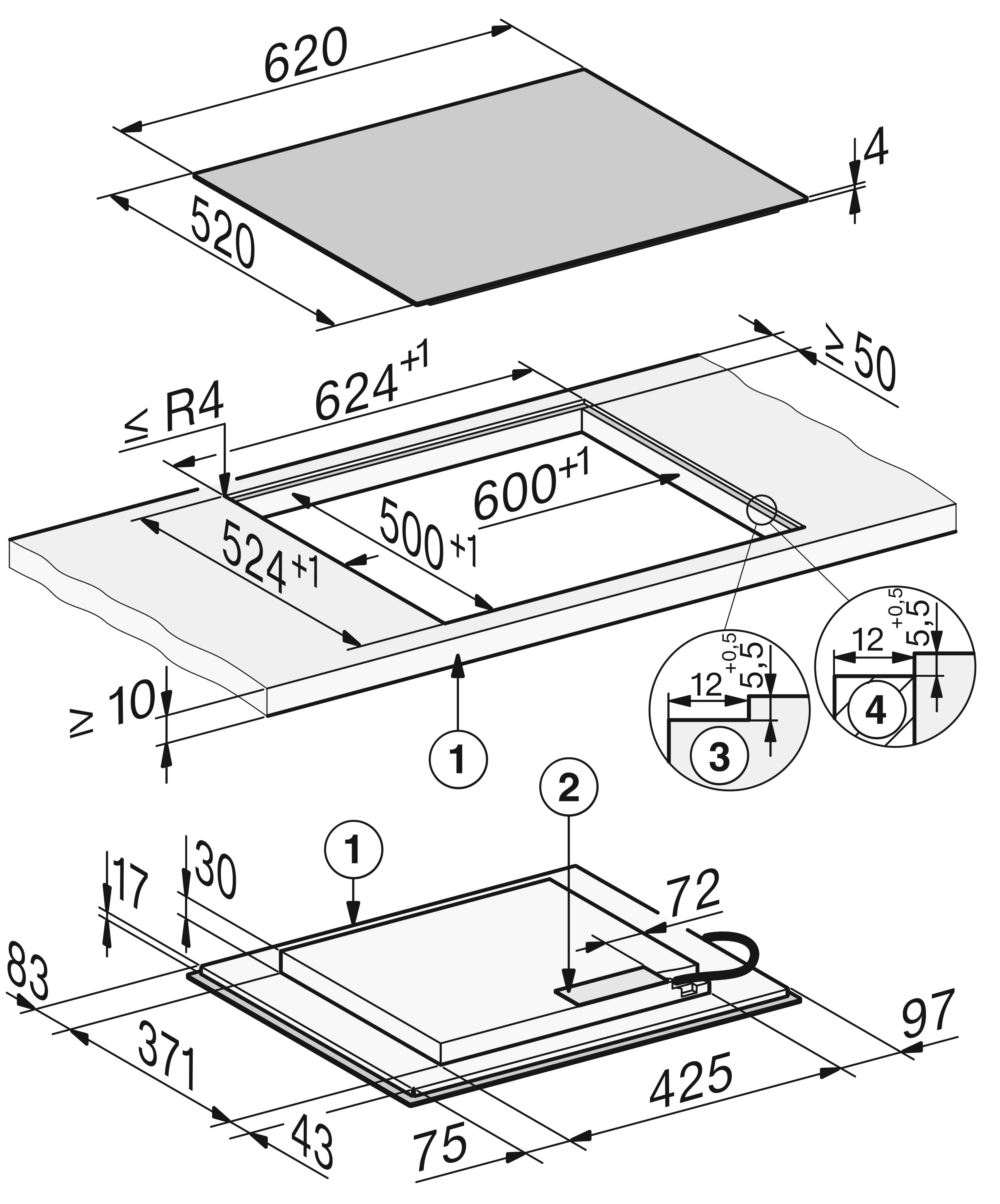 - In 620 mm breed voor integratie in of plaatsing op het werkblad
