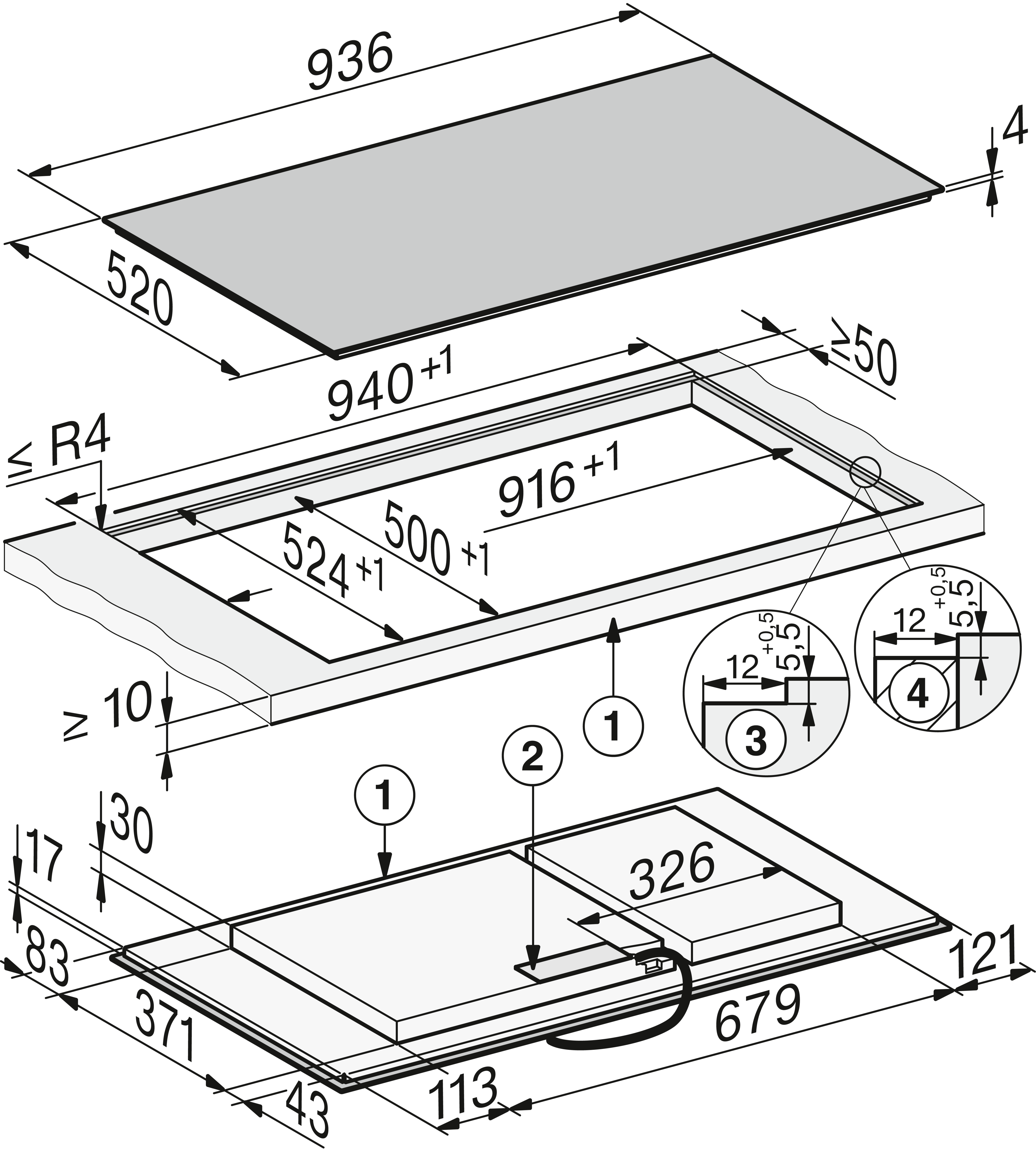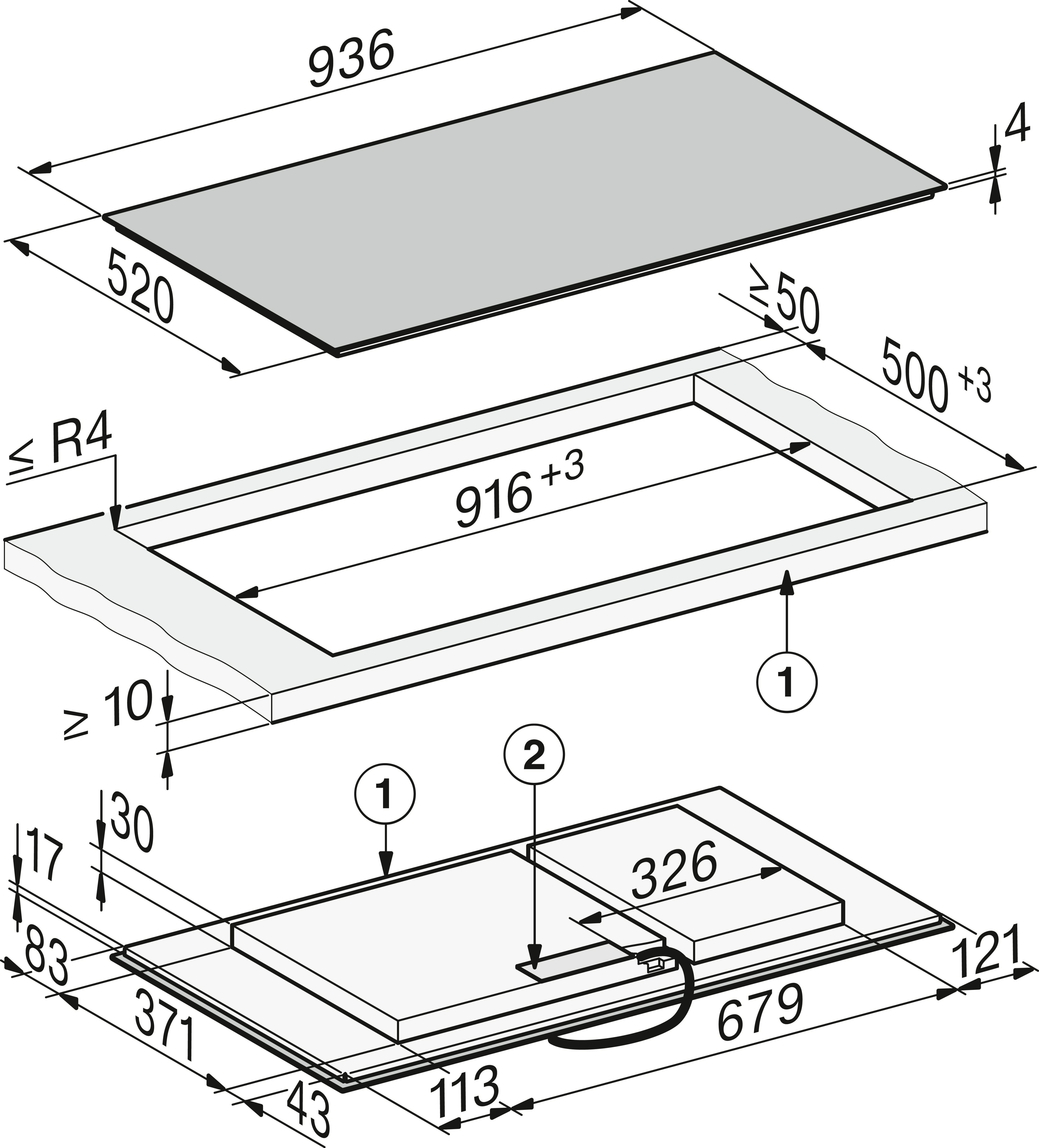 - In 936 mm breed voor integratie in of plaatsing op het werkblad